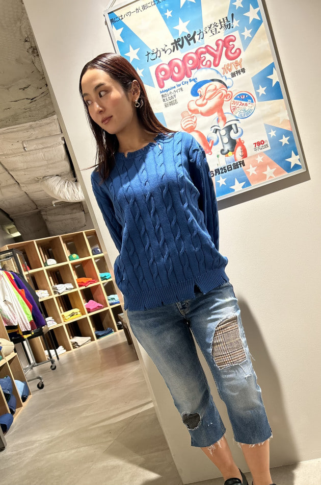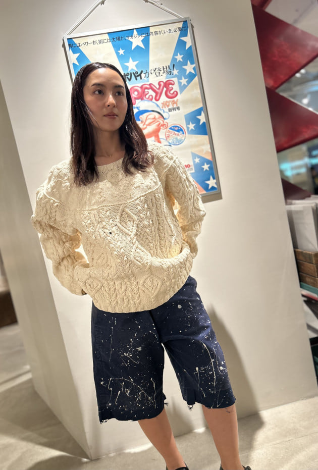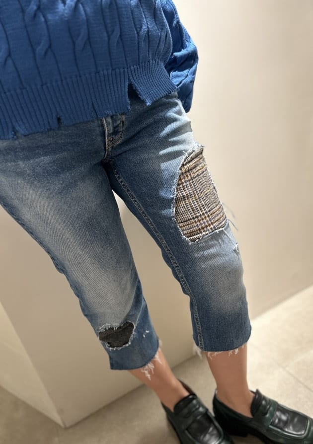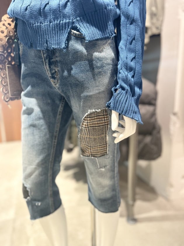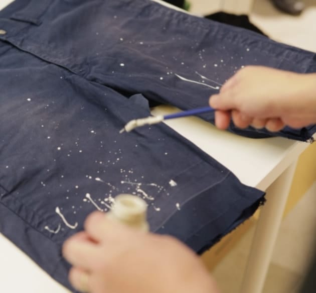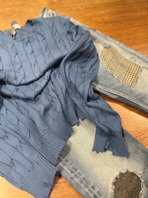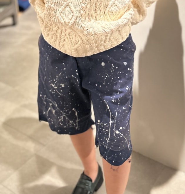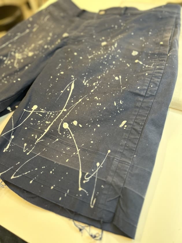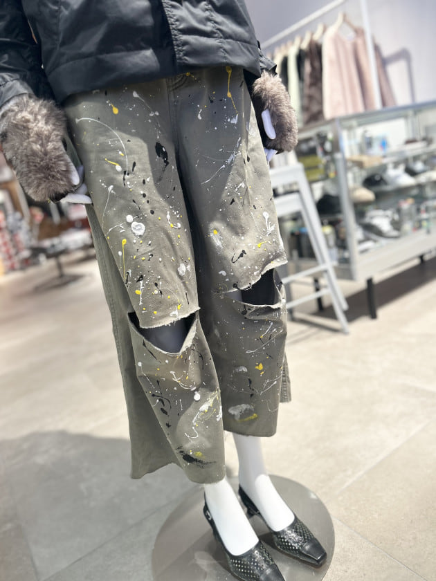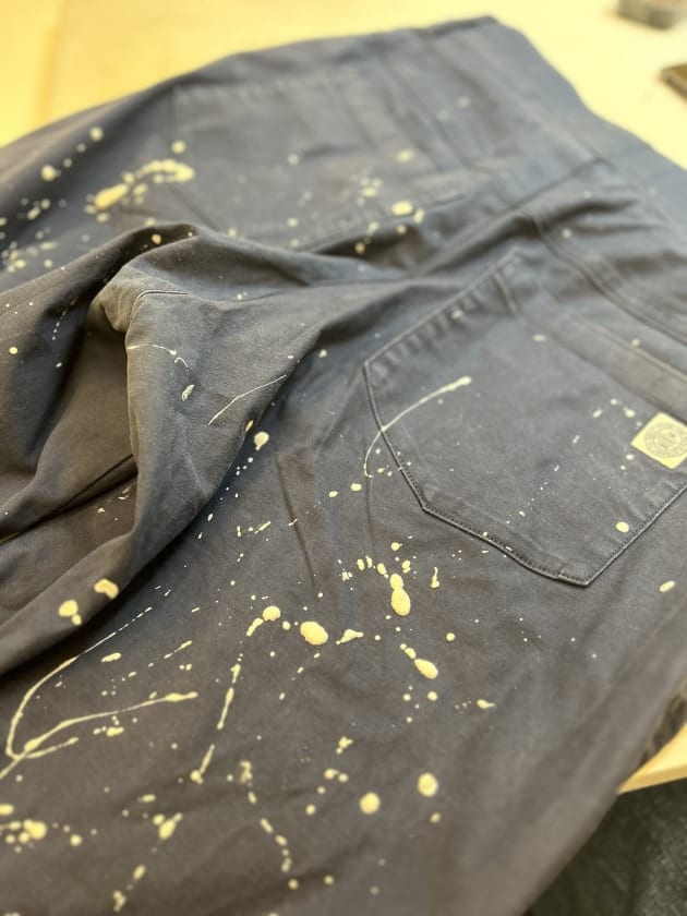 裾のカットオフやボロの膝破れ加工、ペイント加工で使い古しのダメージ感を。