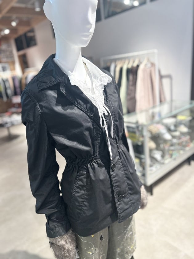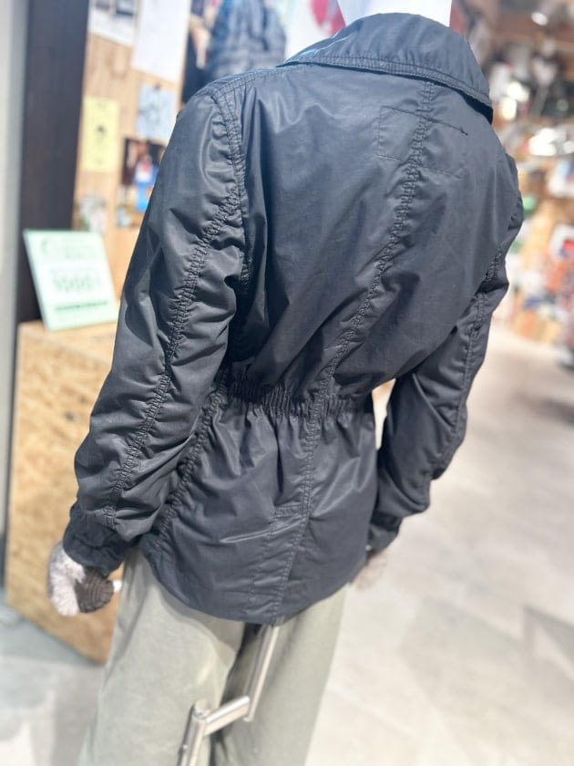 メンズのナイロンシェルジャケットは女性らしくウエストにシェイプシャーリングを追加。