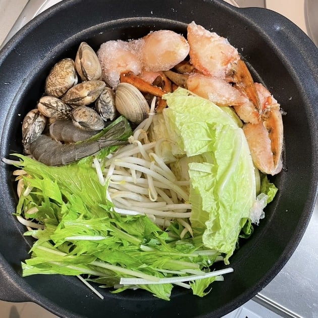 あさり・エビ・冷凍のカニ・白菜・水菜・もやし。