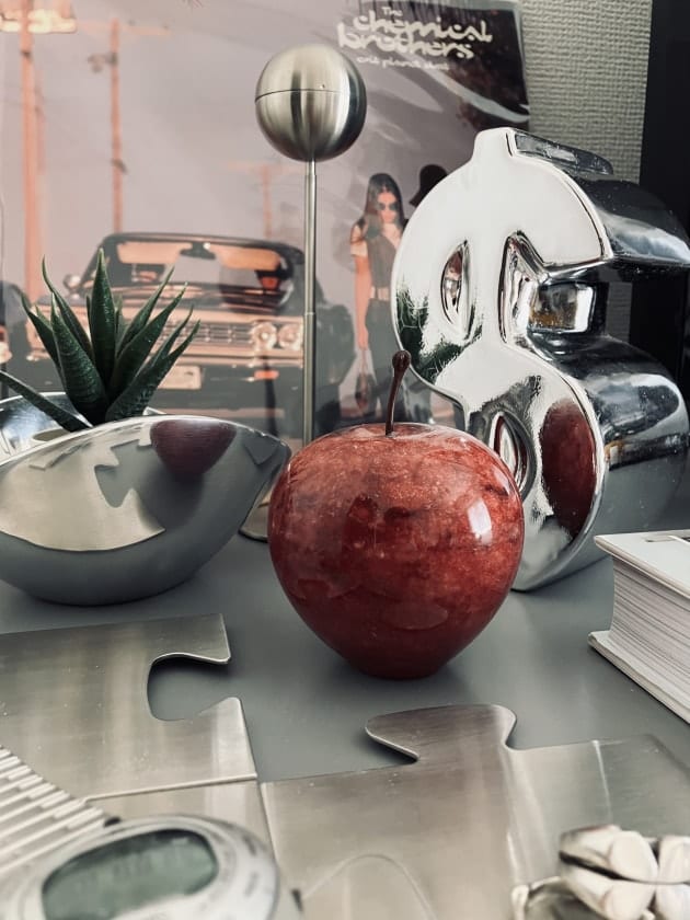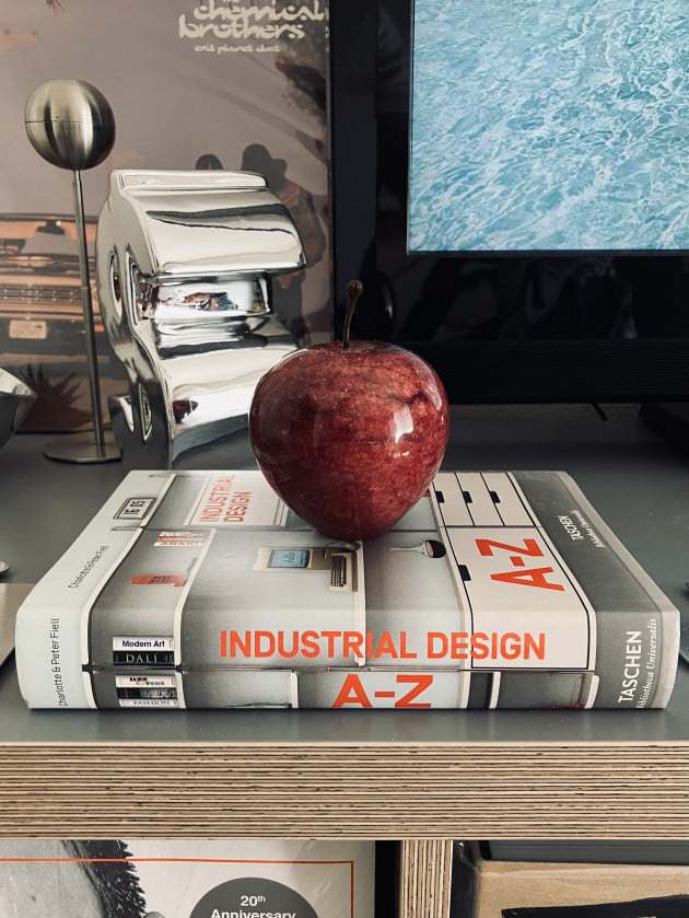 大理石を削り出して作られた林檎のペーパーウェイトは、無機質なステンレスやアルミの素材がまとまった中にも彩りを与えてくれます。