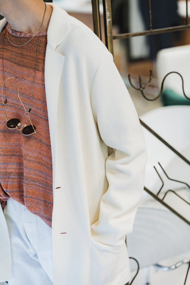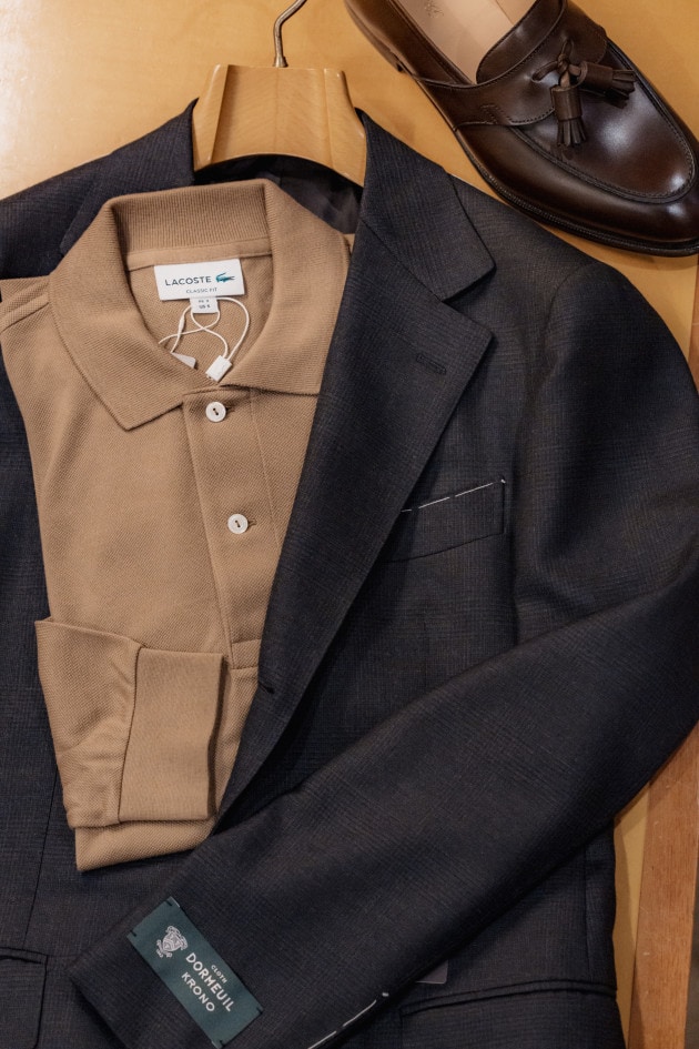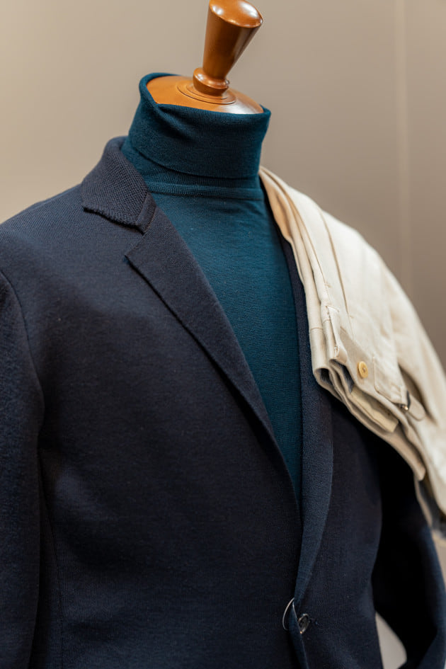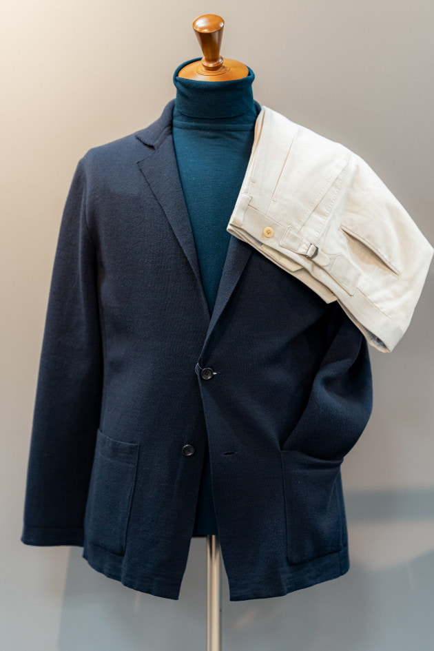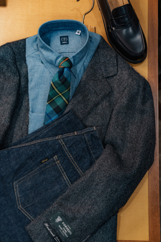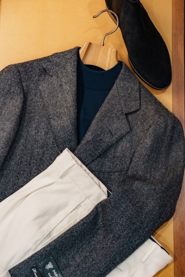 タイドアップ、ニットで1コーディネートずつ組んでみました。濃い色のジャケットなのでコーディネートの難易度は高くないですね。ヘリンボーン柄もふわふわの生地で濃い色なので柄感がわかりにくいと言うところも無地ライクで使えるポイントです。