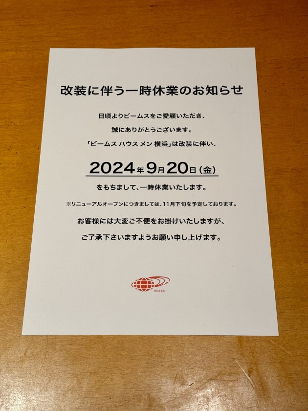 そしてこのブログが私が横浜で書く最後のブログとなりましたので、記念にお店の様子を撮っておきました。以前ご紹介しましたが、ビームス ハウス メン 横浜は9/20の営業を最後に一旦閉店、2ヶ月後にパワーアップして戻ってくる予定です。