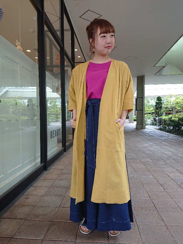 こちらのチェックのカラーはリネンプルオーバーに羽織って、大人カジュアルな印象に。