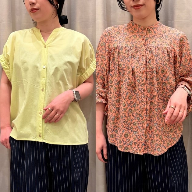 BEAMS HEARTの「切り替え サラサ ブラウス」と「スキッパーネック シルケット カットソー」。