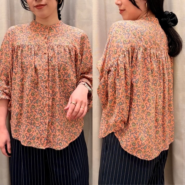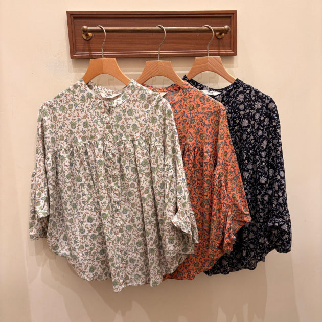 まずご紹介するのは、エスニックな雰囲気漂う「サラサ(更紗)」模様が美しい、切り替えデザインのブラウスです。