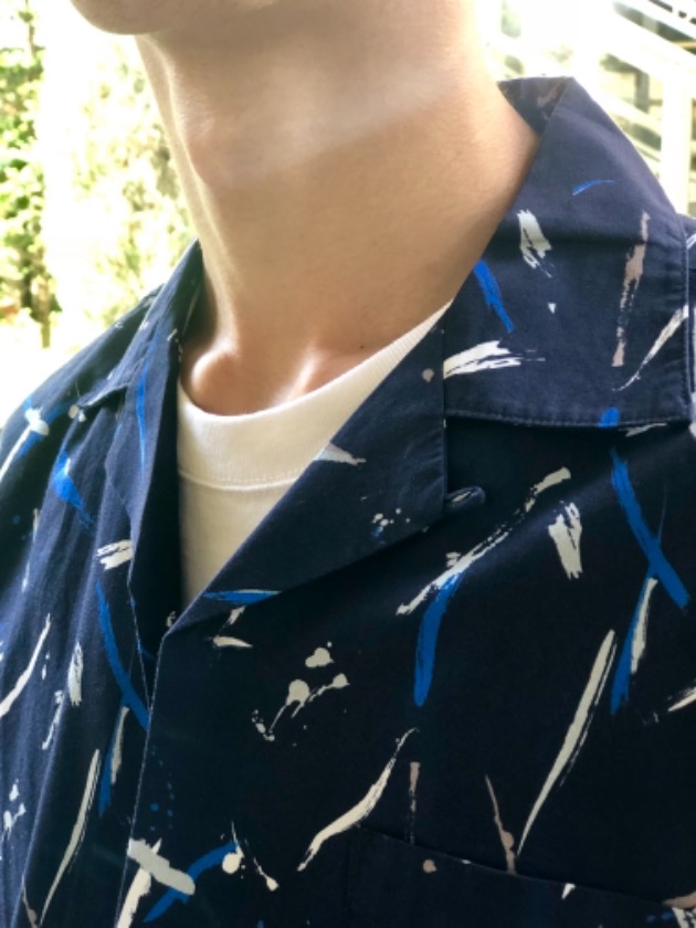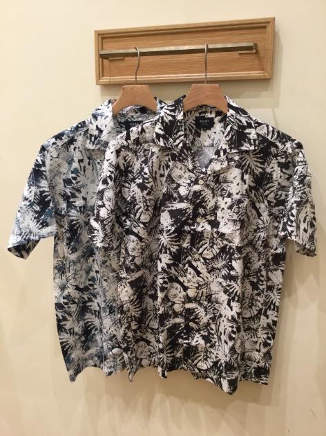 本日はアクセントにもなる柄物オープンカラーシャツでございます。