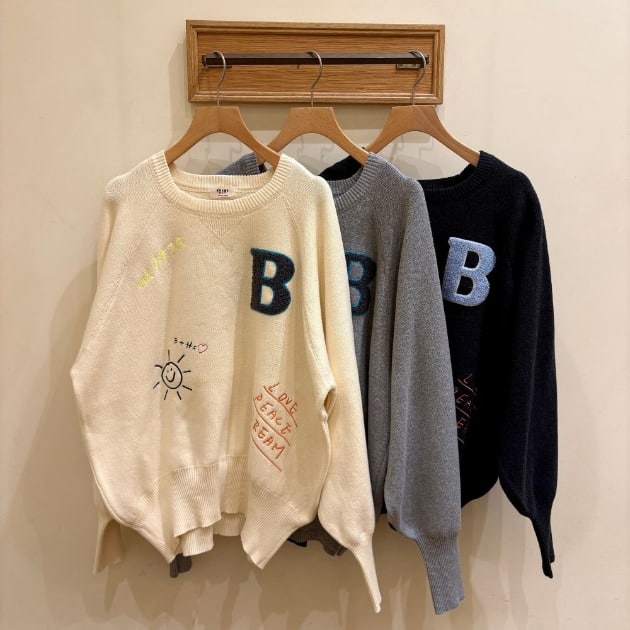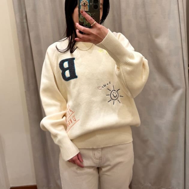 BEAMS HEARTの「スウェットライク ロゴ刺繍 ニット」は、ラフさと上品さを両立した、非常にバランスの良いアイテムです。スウェットほどカジュアルすぎず、ニットほどかしこまりすぎない。だからこそ、普段のスタイリングに取り入れやすく、着回しの幅も広がります。