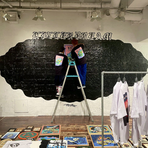 レーベルでの個展は初めてのアーティストで、作品展示もめちゃくちゃ楽しみでした!その前にまずは壁にヤマモトさんがペイントをしてくれました!