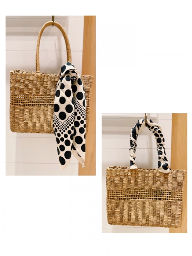 ボトルのスカーフ。夏に持つかごバッグのようなものも描かれている。春〜夏にかけて持ちたいスカーフです。