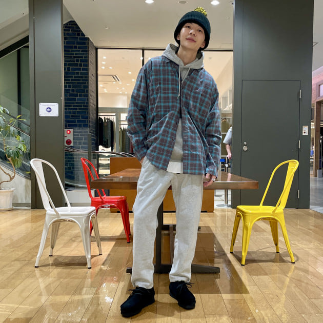 カバーオールを脱ぐとまた雰囲気が変わるスタイリングになっています。