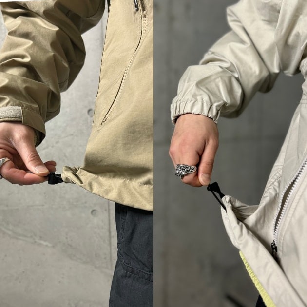 全体的にゆったりで、かなり着込めるサイズ感です。着丈はヒップがすっぽり隠れる長さで、裾のドローコードで調節できます。