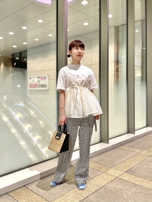 ジャカードのキャミソールを合わせて、ガーリーな装いに。インナーはTシャツでカジュアルダウン。