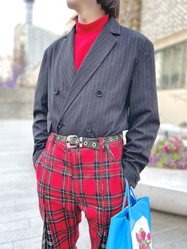 タータンチェックから連想するアイテム選び、という事で、全体的にパンクな雰囲気に。