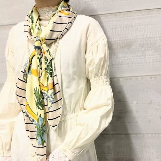 首に一周回してあとはたすき掛けのように脇の下に垂らす付け方が甘過ぎなくてテイストも何でもハマってくれてお気に入り。