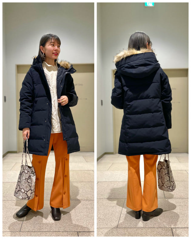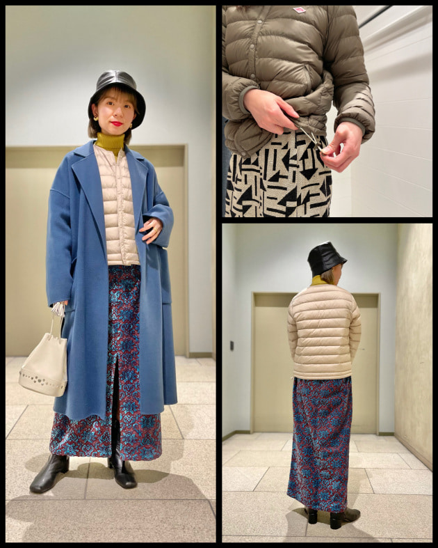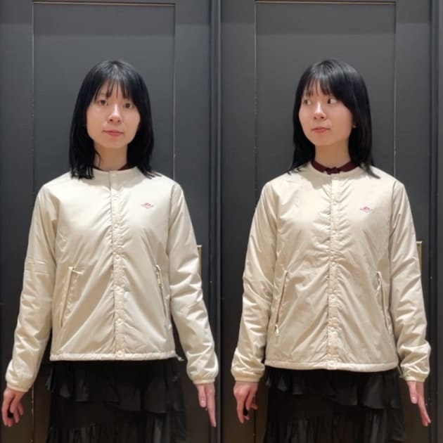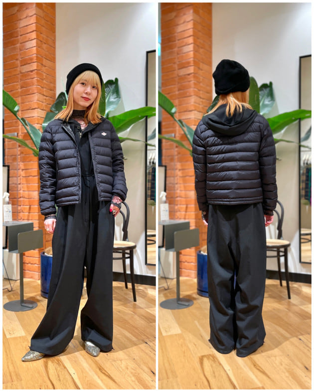 中綿も薄手なので、窮屈感を感じにくいです。着丈はドローコードで調節可能。細身な方や、薄手のインナーで合わせるなら"普段サイズ"で、ゆったりと着たい方や、メインアウターとして少し厚手のインナー合わせもするなら、"普段よりワンサイズUP"がオススメ◎