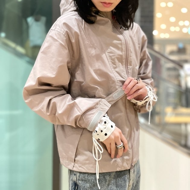 着丈は、ボリュームのあるボトムスとのバランスも取りやすい腰くらいの丈感で、ドローコードで調節できます。