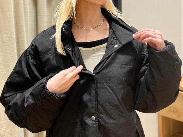 ノーカラーなので、シャツやフーディー合わせもしやすいデザイン。