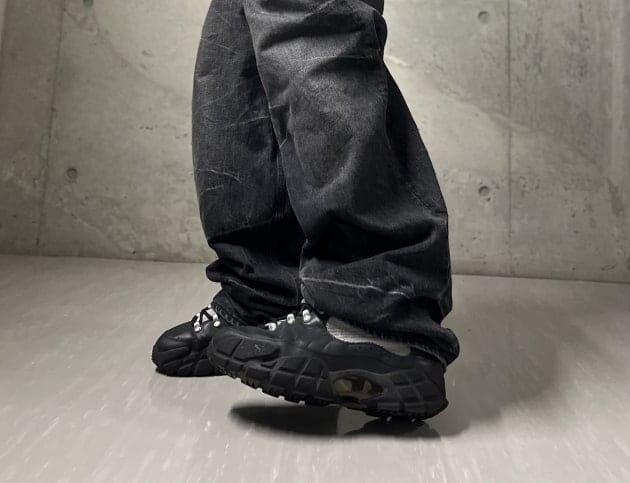 やりすぎないけどちゃんと主張してくれるスニーカーで、こういうスタイリングにはかなり相性いいです。