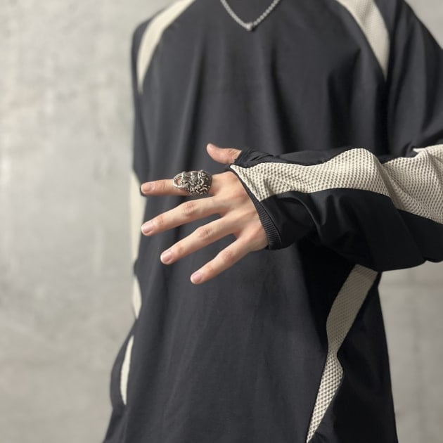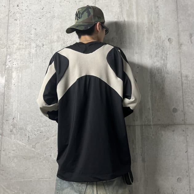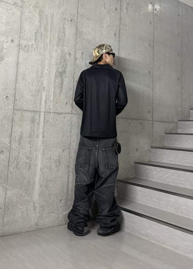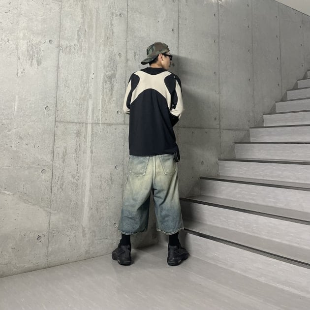 トップスはブラックベースにアイボリーの切り替えが効いた、存在感のあるロンT。
