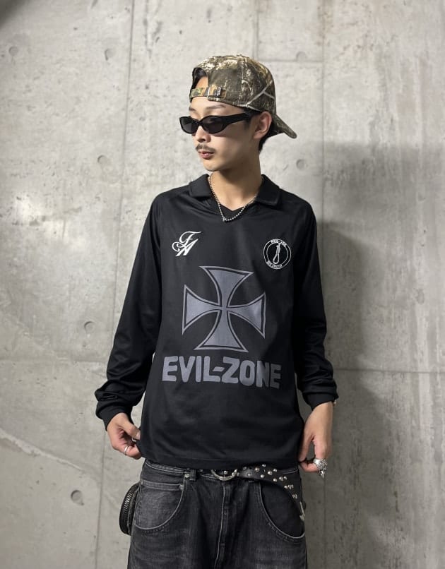 トップスは、フロントに大きめのクロスロゴが入ったゲームシャツ。