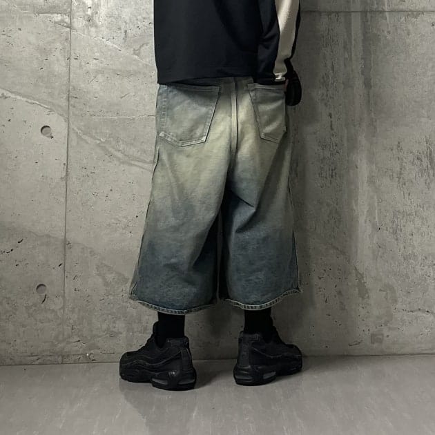 ボトムはorSlow×BEAMSのカモ柄バギーショーツ。膝下丈&太めのシルエットが90’sストリート感をプラス。