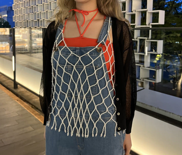 シャツを肩にかけ、頭にはサングラス、そして大ぶりのアクセサリーで「リゾート感」のあるスタイリングになっています。