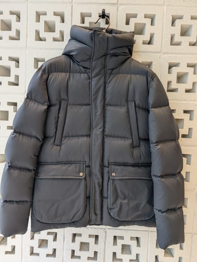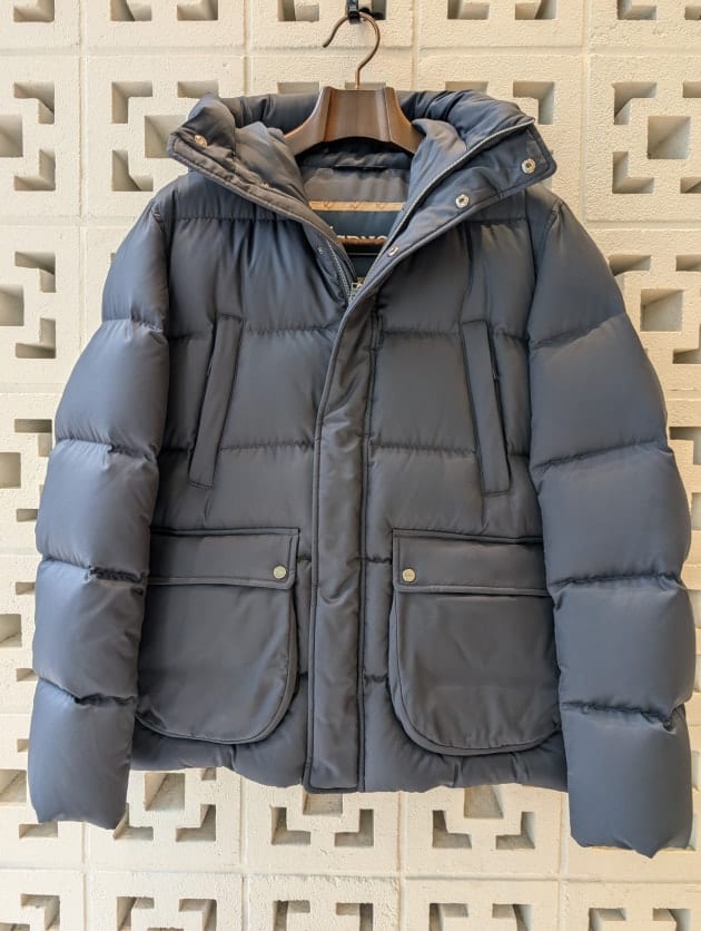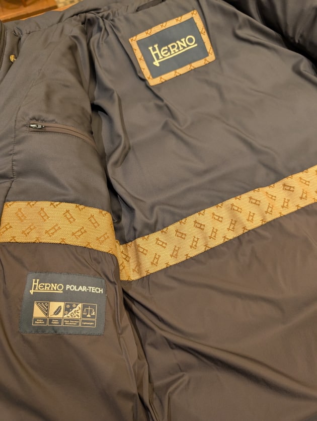 HERNOで人気のあるダウンブルゾンの形に、ラグジュアリーな雰囲気な化繊素材を組み合わせた別注モデルです。