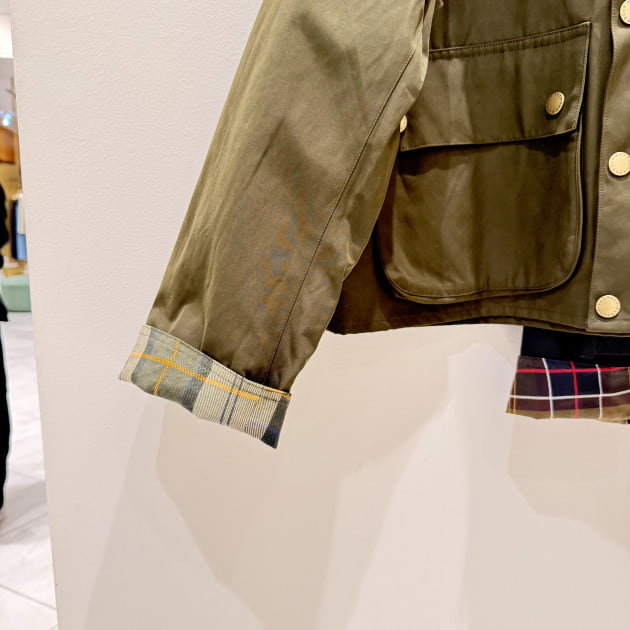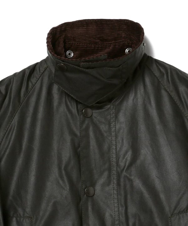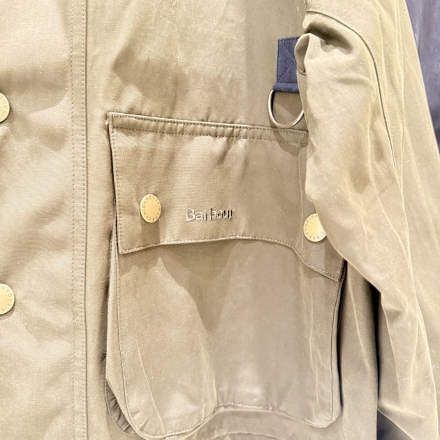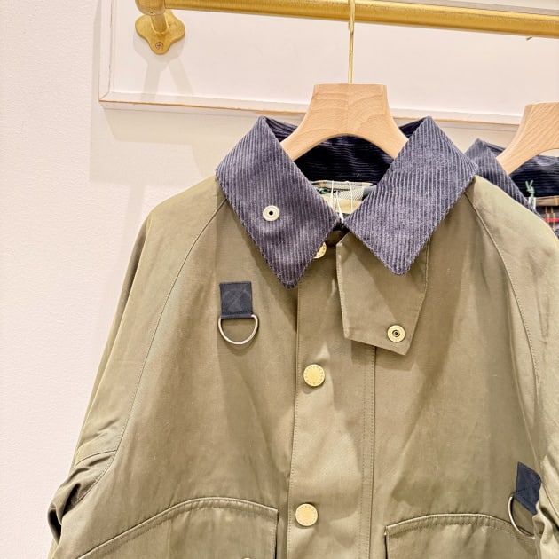 バブアーらしいコーデュロイの襟や、胸元のDカン(元々は釣り道具を吊るすもの)といったクラシックなディテールはそのまま。