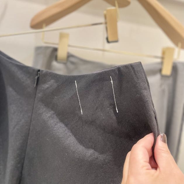 ウエストマークのできるベルトは、金具がロゴという洒落たデザイン。