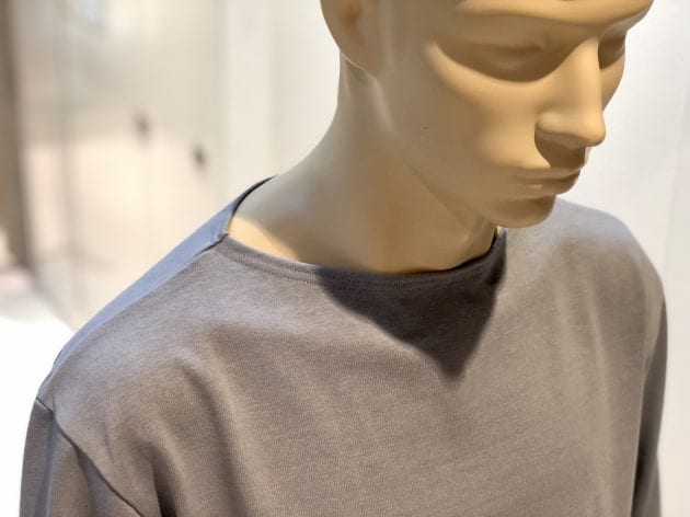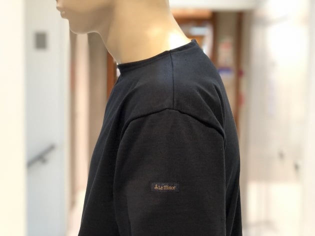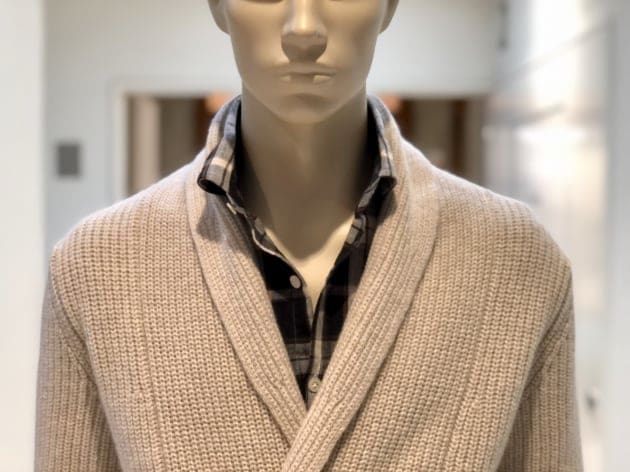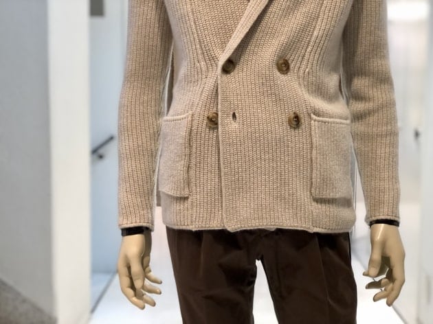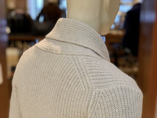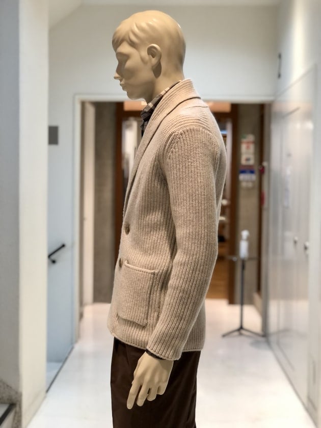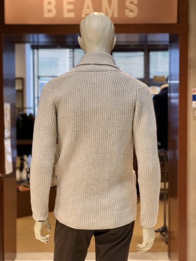 ストライプに表現された針抜き編みは更にニット感を高め、温かみと気品、デザインにも一役買って、まるでジャケット並の様相です。