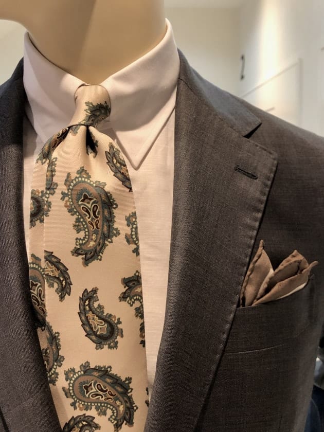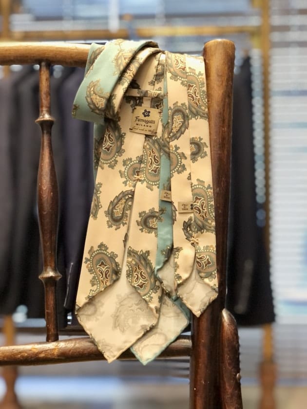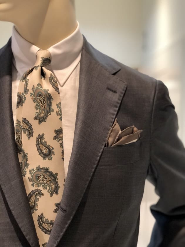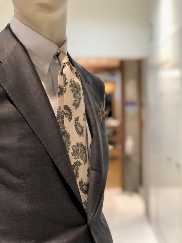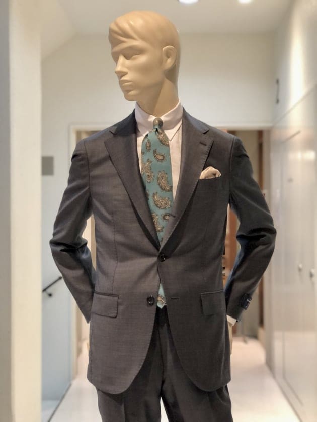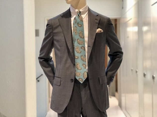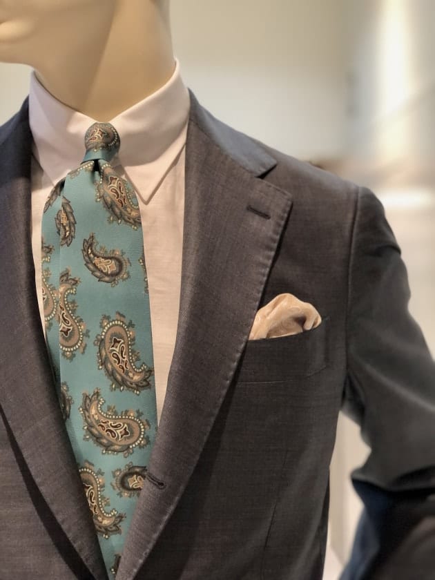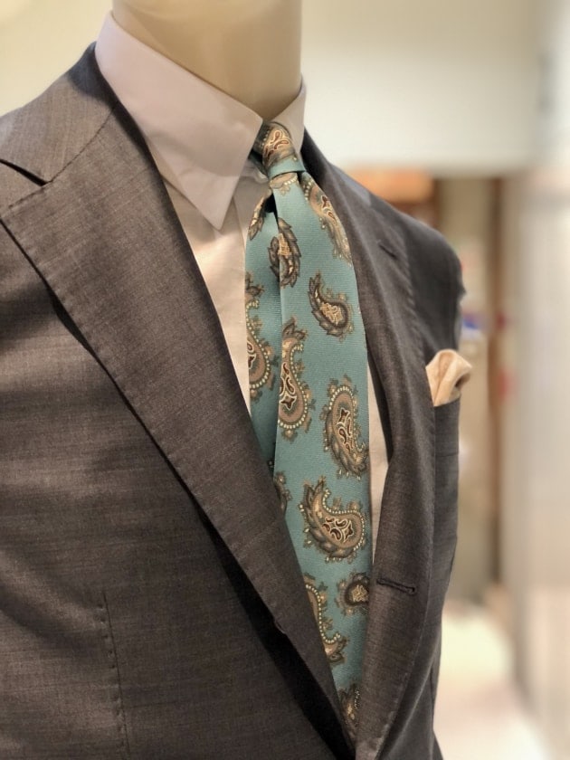 例えば、ブラックのニットタイで引き締めてもかっこいいと思いますが、うす〜くあわ〜い〈Seaward & Stearn(シーワード & スターン)〉のグリーンのストライプネクタイがほのかに彩ります。