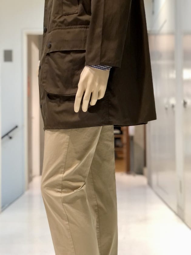 露骨なブラウン系スラックスはミスマッチ…。コットンベージュは土臭くてミスマッチ…。フレスコのグレイッシュなベージュが品を損なわず、かつ全体の清涼感を保つ事ができるお勧めの色です。しかも、お安い。