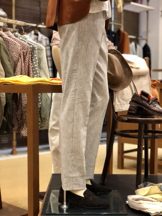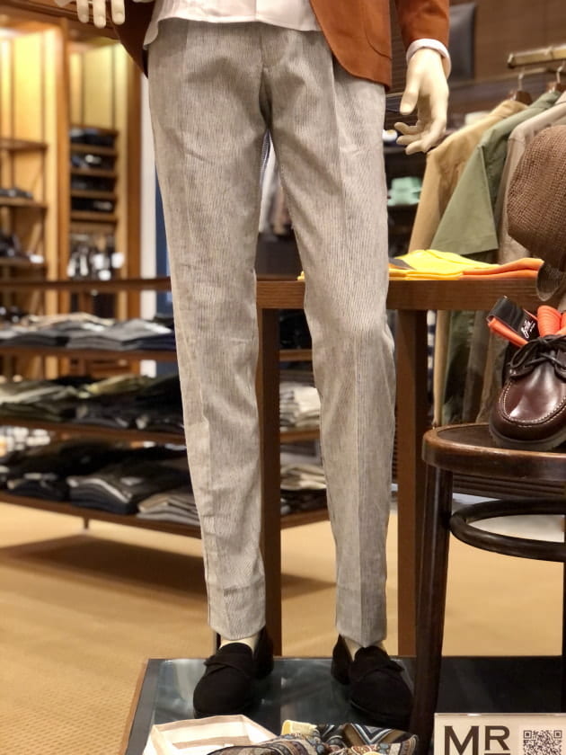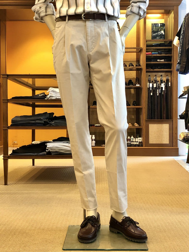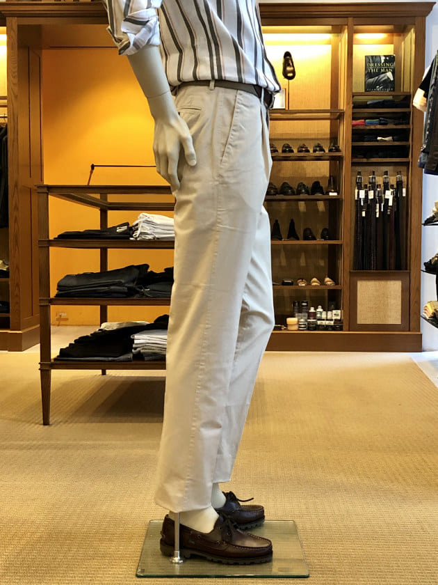 露骨なブラウン系スラックスはミスマッチ…。コットンベージュは土臭くてミスマッチ…。フレスコのグレイッシュなベージュが品を損なわず、かつ全体の清涼感を保つ事ができるお勧めの色です。しかも、お安い。