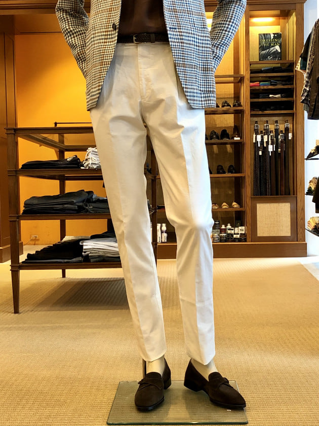 ポリウレタン3%ですが、LORO PIANA社独自の撚糸技術でもストレッチ性をサポート。シルクとリネンそれぞれの特性も活きて、LORO PIANAらしいラグジュアリーなムードは健在です。