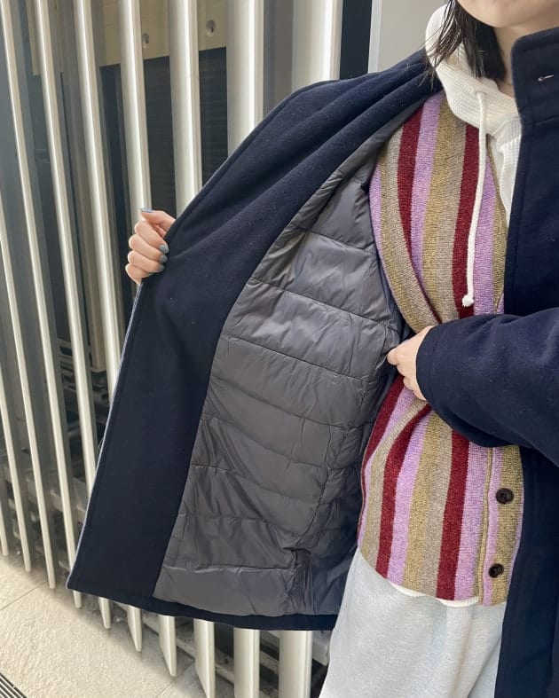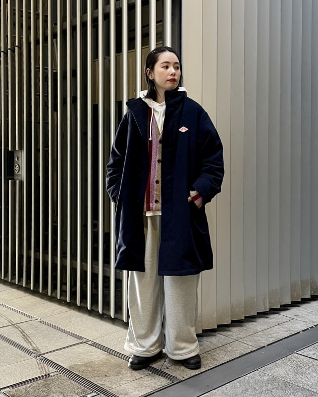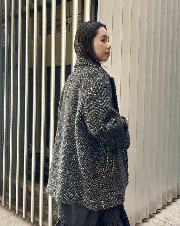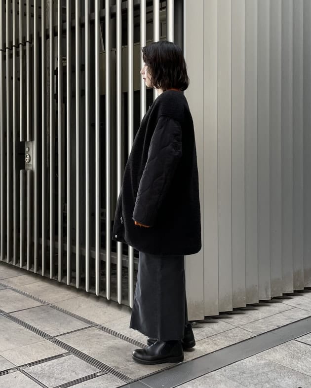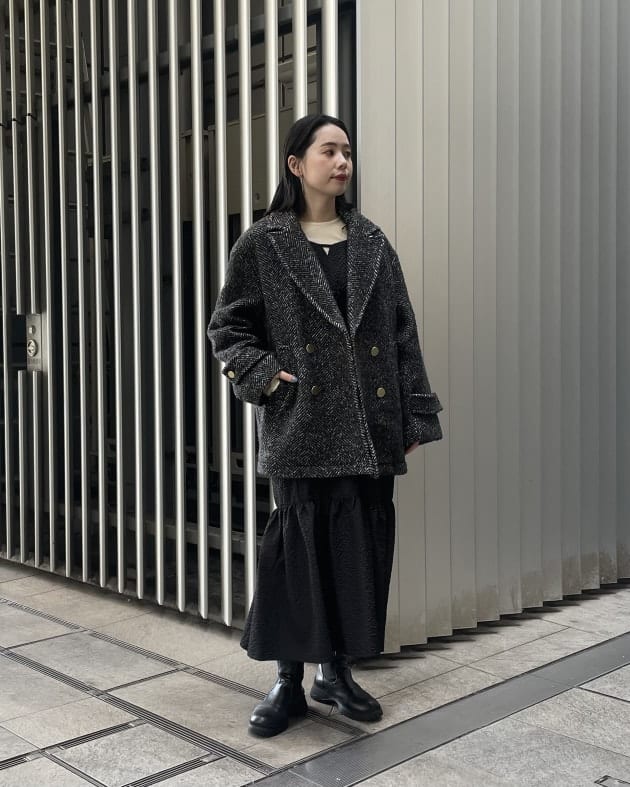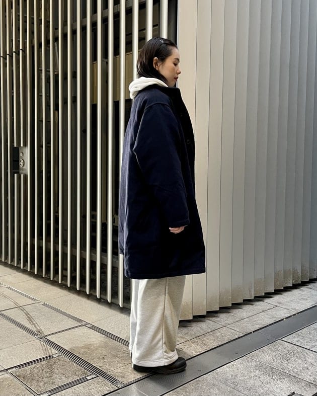 先程のスタンドカラーコートに比べると、そこまでゆったり感はないかもしれません。