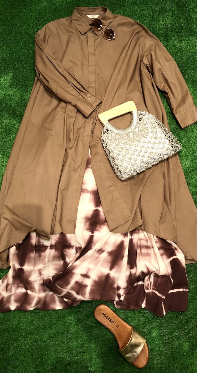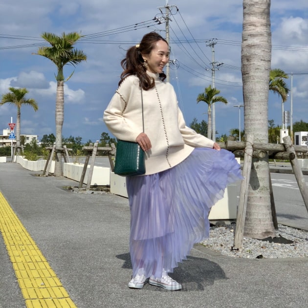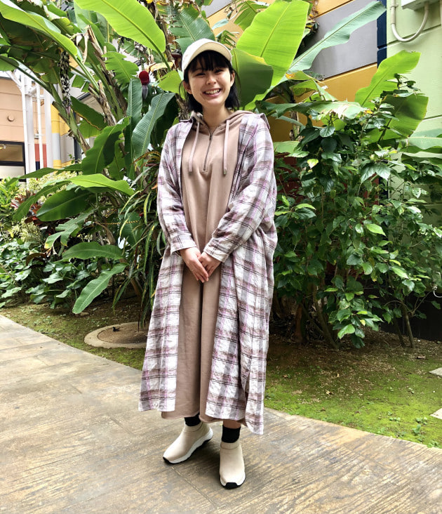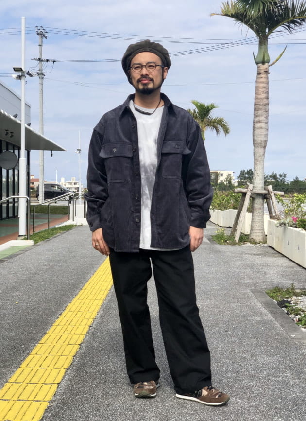 ビッグシャツにストレートスラックスで、リラックス感はありつつも、すっきりとしたスタイリングです。