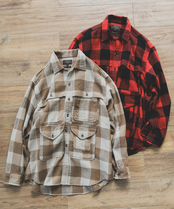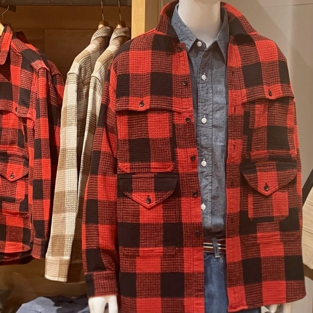 赤のバッファローチェックは直球なワーカースタイルの羽織りに最適◎