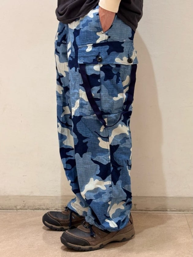 インディゴの濃淡でCAMO柄を表現した斬新な切り口が特徴的な6ポケットミリタリートラウザーズ。