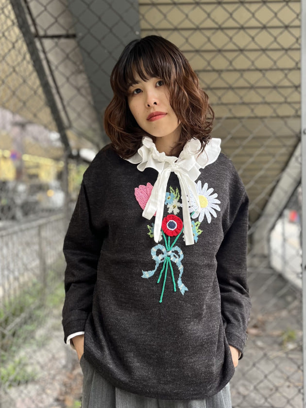 襟付きのクラシックな雰囲気で、羽織りにもトップスにも◎。シンプルなボトムと合わせて、バランスの取れたスタイリングを楽しめます。