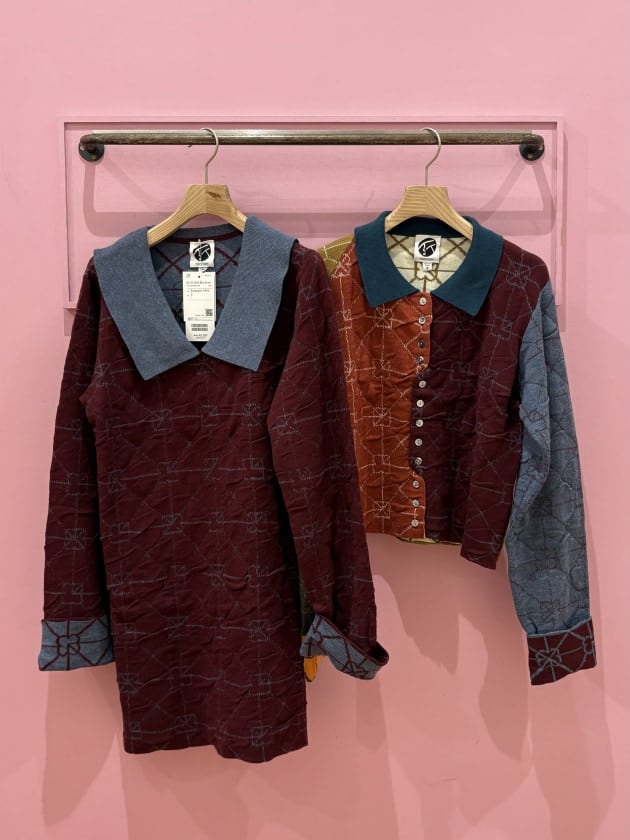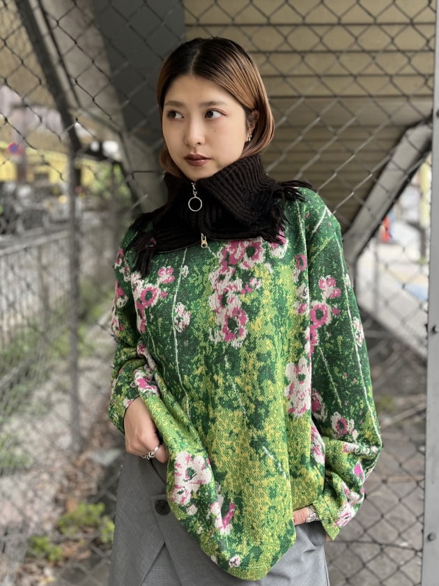 〈GIM CONTEXT〉に別注した特別なクルーネックニット。庭園絵画のようなグリーン×ピンクの配色が美しく、編みのテクニックで立体感のある表情に仕上げています。