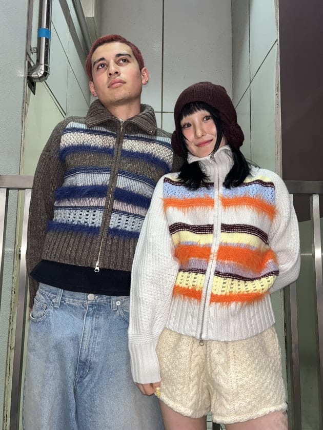 〈BOUSSOLE〉×〈Ray BEAMS〉の別注カーディガン。冬の街に映えるカラーリングと、立体感のあるボーダー柄が印象的な1枚です。