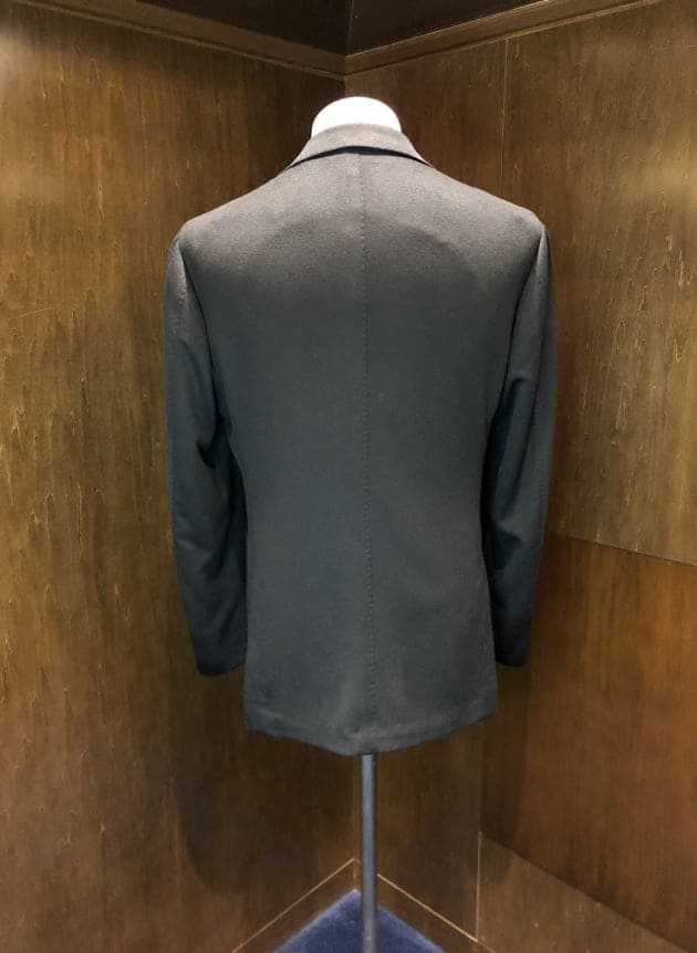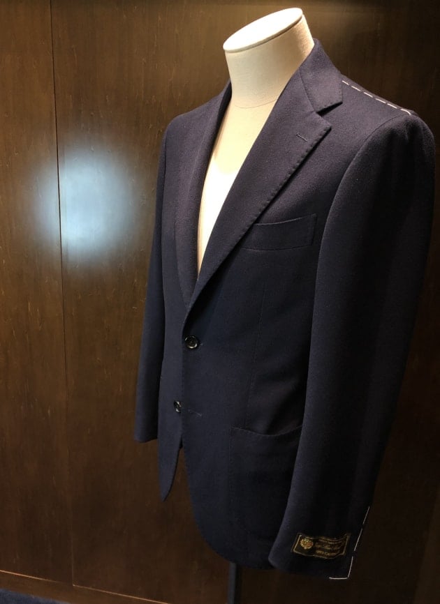 イタリア産のLORO PIANAのウール×シルクを使った上質で着心地も軽やかな生地に発色の良いブルーストライプシャツと裏地を用いてない軽い仕上がりのブルーソリッドタイを合わせて陽気なクラシコイタリアをイメージしてみました。