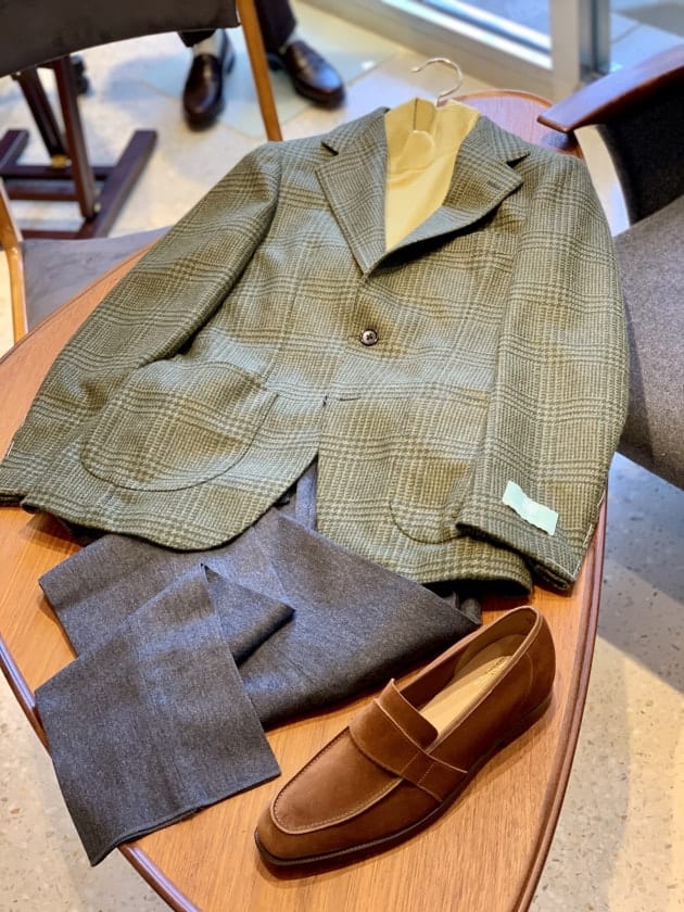 粗野な雰囲気のあるガンクラブジャケットを少し上品に魅せた絶妙な生地感だなと思っています。