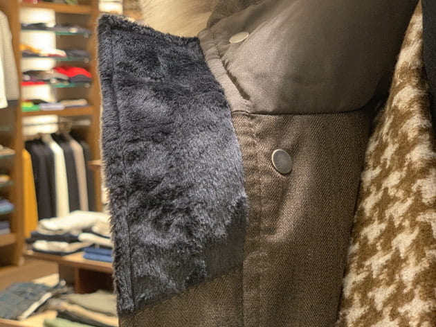 素材はウールと見間違えるほど柔らかい印象のポリエステル素材を使用しております。毛羽立ちなどの心配も少なく、撥水性も持ち合わせた別注モデルとなっております。ヘリンボーン織にした事でエレガントな印象に生まれ変わりました。