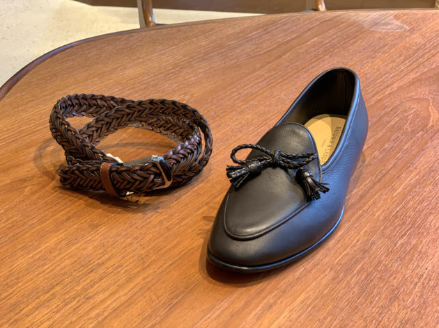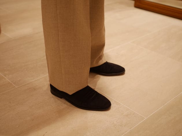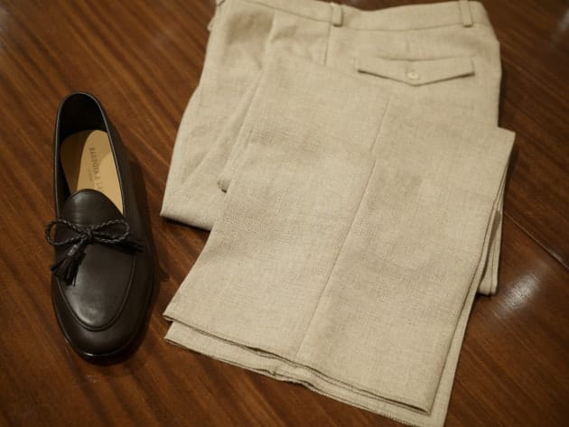 Vol.1の時よりも更に軽やかな雰囲気のこちらをチョイス致しました。ローファーは世界で最も美しいベルジャンシューズと称される<Baudoin & Lange>に別注したモデルです。軽さとエレガントさが今回のコーディネートにピッタリですね!
