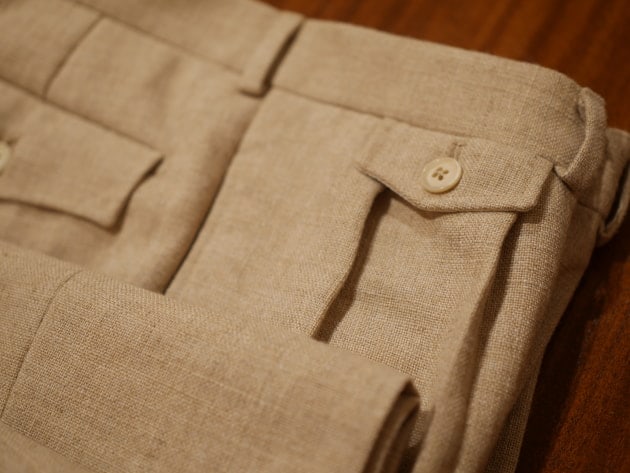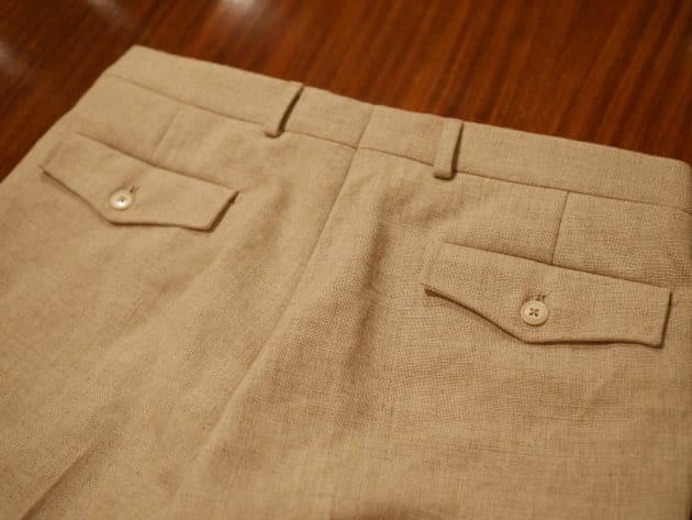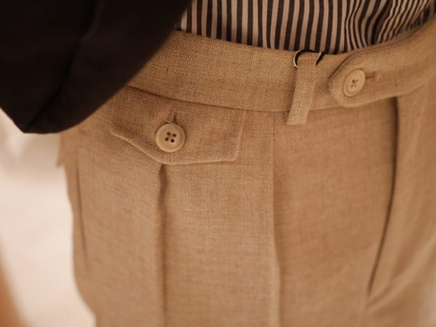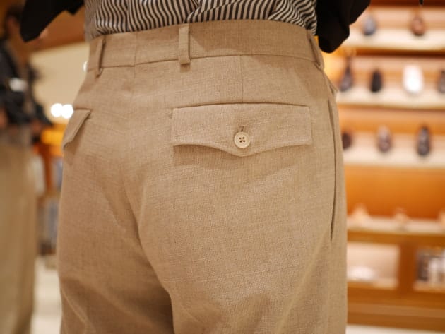 2プリーツ、チェンジポケット、ベルトループと腰回りにディテールが多めですが、股上の浅いシルエットでスッキリ見せています。