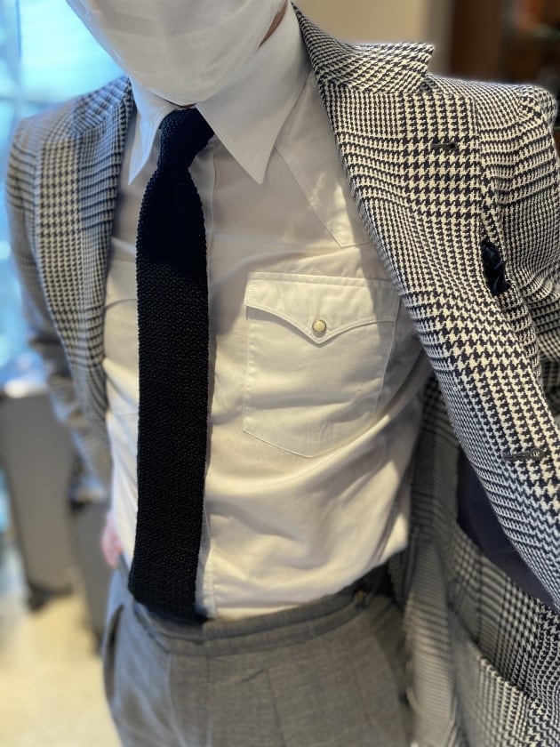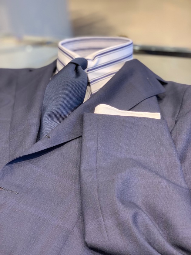 スタッフ野中のVゾーンからチェック柄を拝借。イタリア人の好む青色と茶色の組み合わせですね。スーツスタイルにチェック柄を上手く取り入れております。