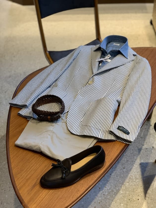 ベルトも少し華奢なメッシュベルトに致しました。シアサッカーの軽さに合わせて細部まで気を遣っていきましょう。