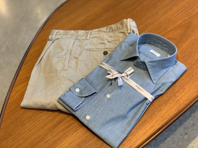 カジュアルなクールビズスタイルがテーマですのでシャツもスポーティに。こちらの<Borriello>のシャンブレーシャツはいかがでしょう?ワイドな襟型なのでノータイスタイルに持ってこいです!