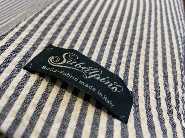 生地は<Subalpino>のシアサッカーです。<Subalpino>と言えばシアサッカー。定評があります。シアサッカーの良いところは凹凸が通気性を生み、盛夏にもってこいという点と、軽く小脇に抱える位ならシワになりにくいので持ち運びに持ってこいという点もクールビズ時にオススメです。お値段も控えめです。